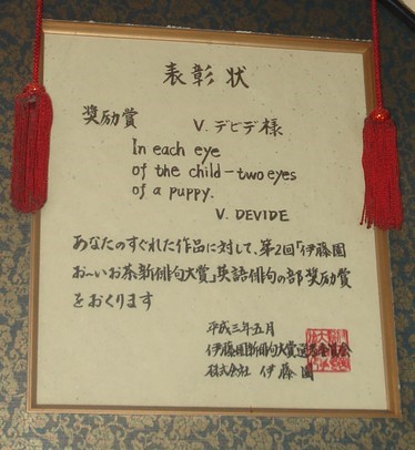 Vladimir Devidé received 18 prizes on various Japanese international haiku competitions. Above is one of his earliest Japanese prizes: